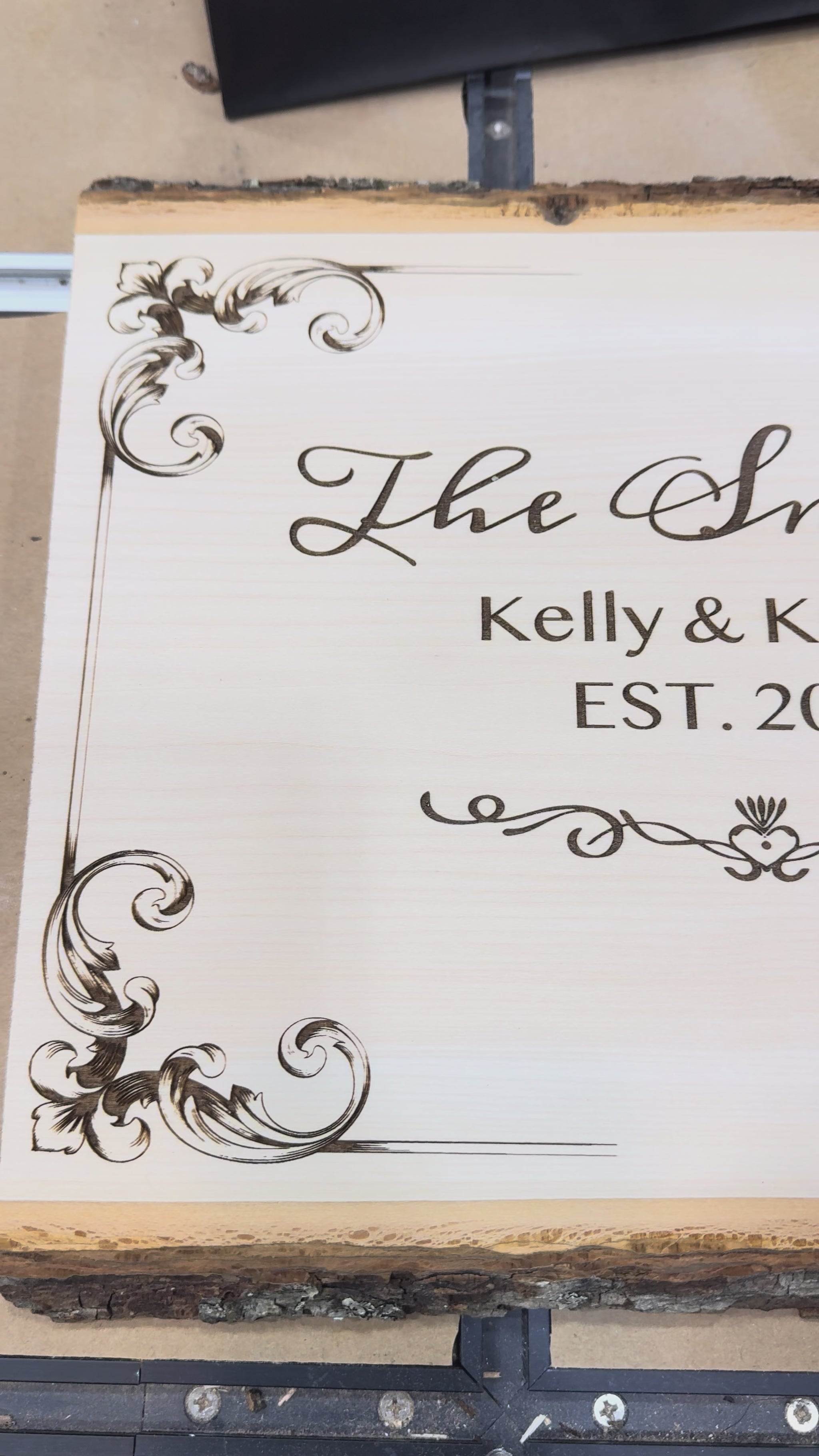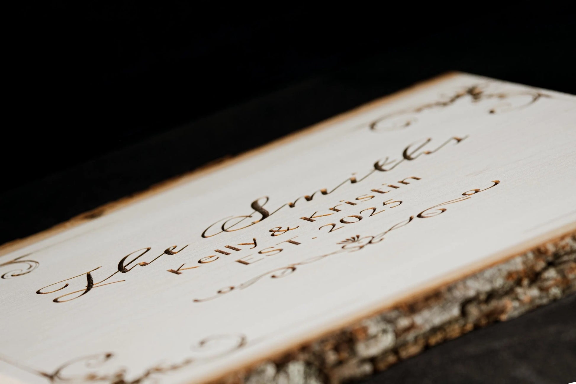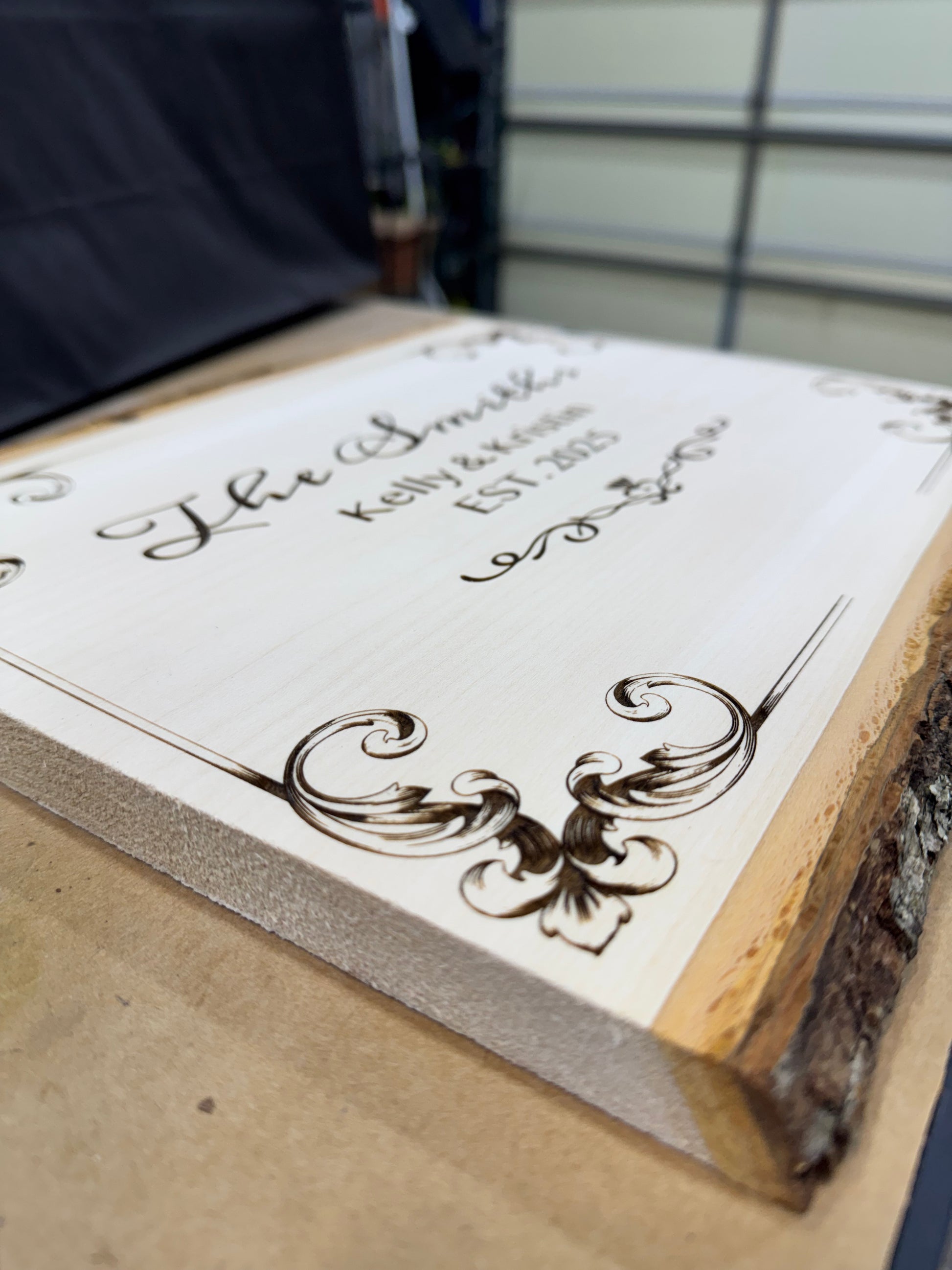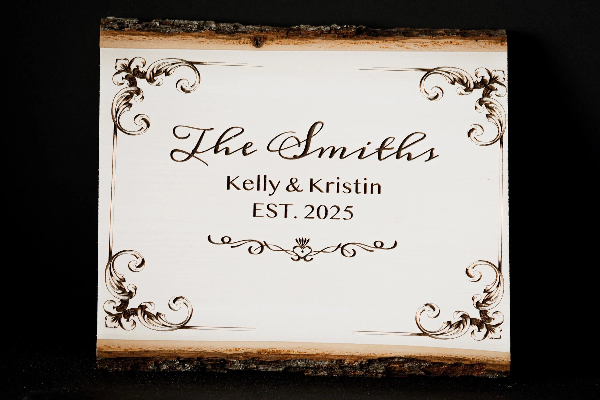 A rustic wood plaque with natural bark edges, personalized with your custom laser engraving. Perfect for family name signs, wedding gifts, memorial plaques, and home décor.